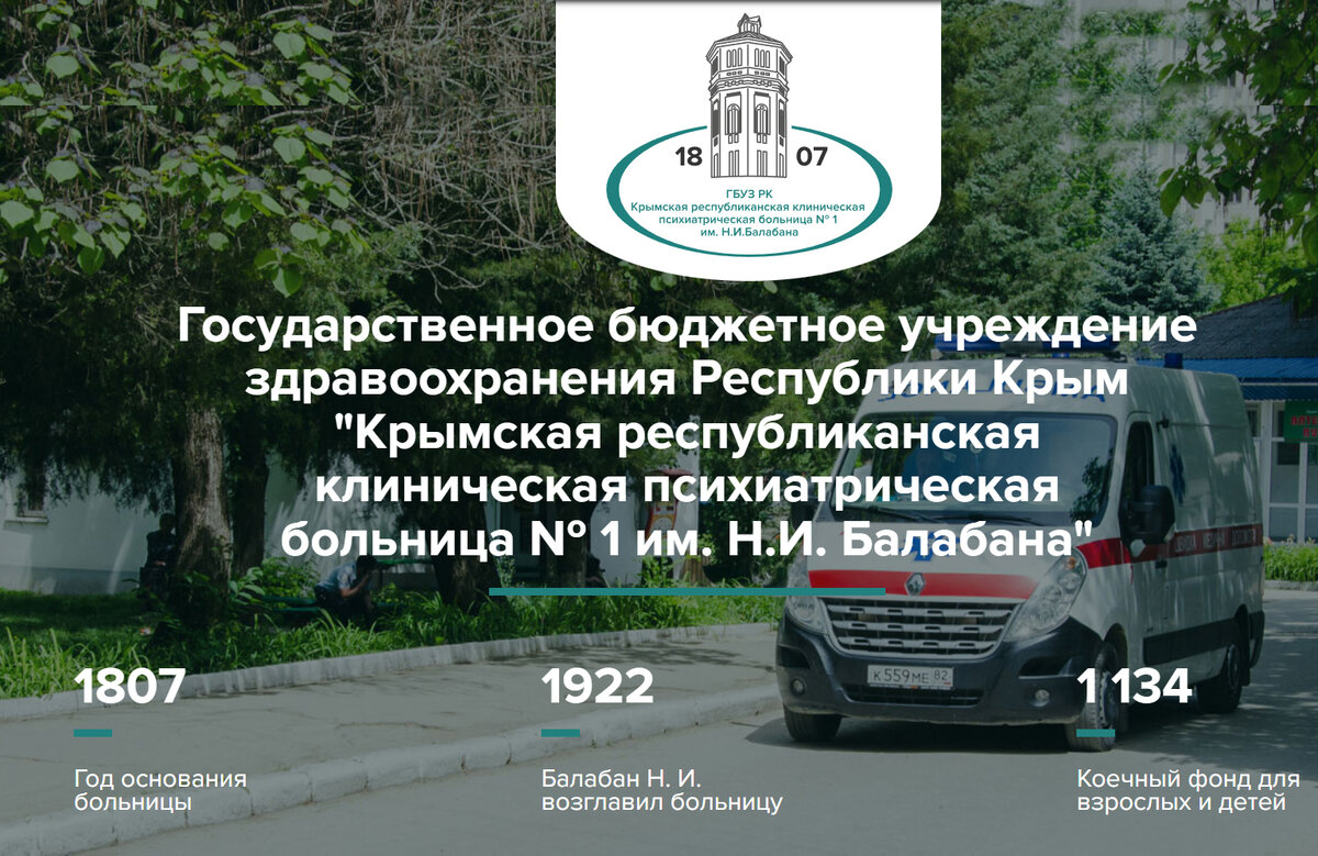 Данная статья основана на информации взятой со страницы "История" сайта первой клинической психиатрической больницы Симферополя, которая в свою очередь представляет собой отрывок статьи Олега Широкова, размещенной на сайте издательства Крымское эхо https://c-eho.info/dvesti-let-psihiatrii-krma/
