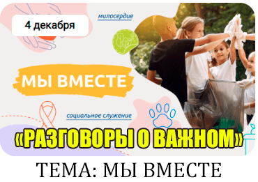 Классный час разговоры о важном 4 декабря 2023 года тема занятия «мы вместе» сценарий, презентация, видеоролики, интерактивное задание и другие материалы для проведения цикла внеурочной деятельности по ФГОС проекта «Разговоры о важном» 4 декабря 2023 года в школе России с 1 по 11 класс, а также в СПО.