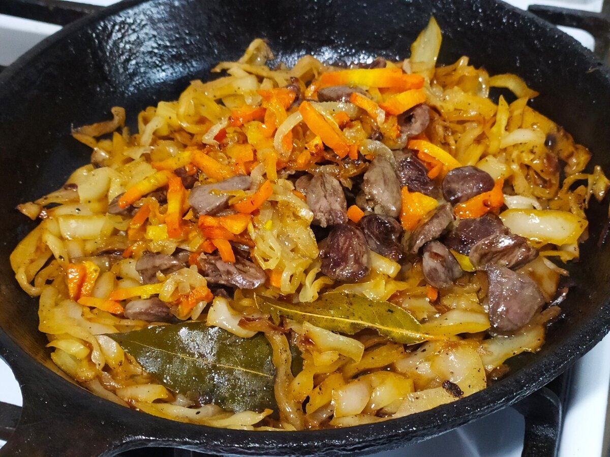 - Когда капуста станет мягкой, добавьте обжаренную печень и перемешайте все ингредиенты. Продолжайте тушить еще 2-3 минуты, чтобы все компоненты соединились вкусно и ароматно.