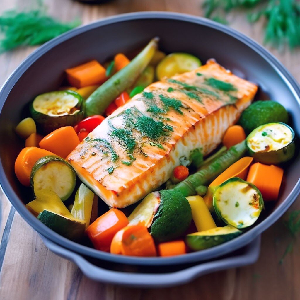 Запеченный лосось с овощами - это прекрасный вариант для тех, кто хочет насладиться вкусным и полезным блюдом. Лосось богат омега-3 жирными кислотами, которые положительно влияют на сердечно-сосудистую систему и общее состояние организма. Овощи, в свою очередь, обеспечивают организм витаминами и минералами, необходимыми для нормального функционирования. Для приготовления запеченного лосося с овощами вам понадобятся следующие ингредиенты: -4 куска лосося (примерно по 150 г каждый) - 2 средних моркови - 1 крупный лук - 1 красный перец - 1 желтый перец - 1 зеленый перец - 2 средних помидора - 2 столовые ложки оливкового масла - Соль и перец по вкусу - Свежие зелень и лимон для подачи Первым шагом я рекомендую приготовить овощи. Морковь нарежьте тонкими полукольцами, лук - полукольцами, перцы - полосками, помидоры - кубиками. Затем разогрейте сковороду с оливковым маслом и обжарьте овощи до мягкости. Приправьте их солью и перцем по вкусу. Теперь перейдем к приготовлению лосося. Предварит