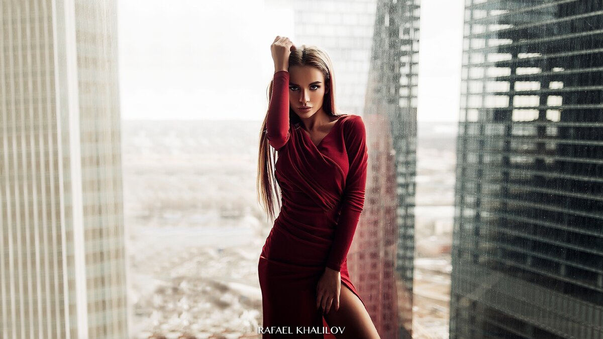 Девушка в красном на фоне небоскрёбов - поэма большому городу