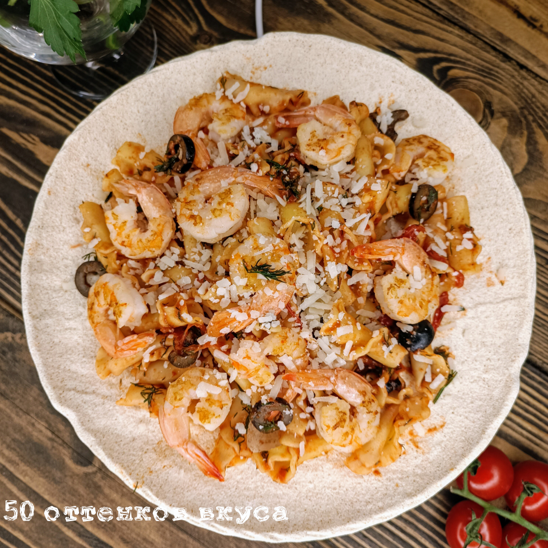 Обожаю пасту, всё-таки итальянская кухня для гурманов... Все мои подписчики тоже гурманы и любители вкусно поесть, раз подписаны на мой блог! Присоединяйтесь к нашему клубу ценителей вкусной еды, нажимаем кнопочку подписаться! Рецепт пасты очень простой, справится каждый. И так. Пасту отвариваем до состояния альденте. А пока варятся макарошки приготовим соус и креветки. В сковороду вливаем немного воды, кладём разрезанные на кусочки помидоры, томатную пасту, смесь перцев соль и доводим до загустения. Затем в сковороду отправляем, измельчённый укроп, кружки маслин и всё перемешиваем. Отваренные креветки чистим и обжариваем с двух сторон до золотистого оттенка. В сковороду с соусом кладём готовые макарошки, перемешиваем и выкладываем на тарелку. Сверху кладём обжаренные креветки и посыпаем тёртым твердым сыром. Бон аппетит! Берём; - паста 150 г. - креветки 250-300 г. - твердый сыр 30-50 г. - помидоры 2-3 шт. - маслины 10-12 шт. - томатная паста 1 ст.л - пучок укропа - соль, пе