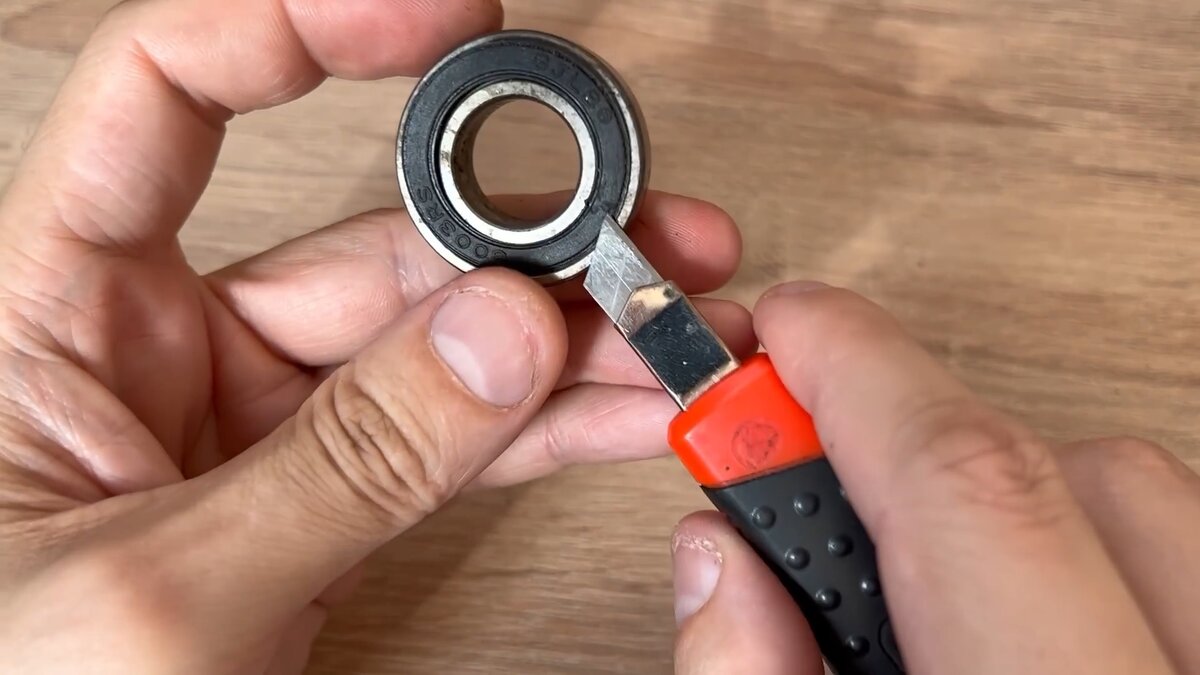 Недавно мне понадобилось смазать закрытый подшипник, который начал слегка шуметь. Открыть пыльник на нем можно при помощи ножа или шила, все делается очень легко, но также просто можно повредить резинку на пыльнике, из-за чего со временем смазка начнет выходить из подшипника и он придет в негодность.