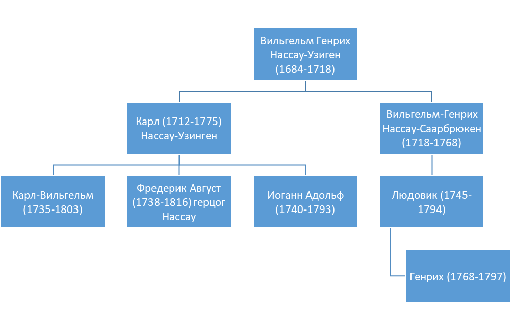 А пока прошло не так уж и много времени, как принцам дома Нассау пришлось отправиться в изгнание или приспосабливаться к Наполеоновской эпохе, перекроившей карту Европы. Вальрамовская лини и правда неплохо приспособилась; Бонапарт их знатно, конечно, обобрал, но и оставил немало за покорность. Только Генрих Нассау-Саарбрюкен (1768-1797) сражался с французами в рядах прусской армии, после того, как его отец Людвиг (глава ветви, подписавший Семейный пакт) был изгнан из своих владений.