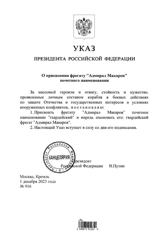 Президент Российской Федерации Владимир Путин подписал Указ «О присвоении фрегату "Адмирал Макаров" почетного наименования» http://publication.pravo.gov.ru/document/000120231201..