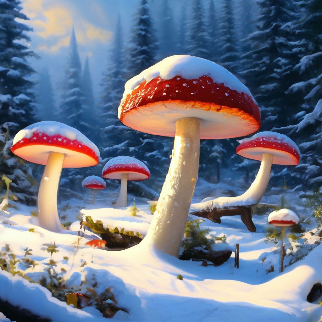 Жили-были зимние большие грибы в дремучем лесу. Они были особенными, потому что только зимой они могли просыпаться и расцветать. Их шляпки были покрыты снегом, а стебли хрустели от мороза. Однажды волшебница зимы прилетела в лес и увидела эти великолепные грибы. Она решила принести им подарок - волшебную пыльцу, которая заставит их расцвести еще ярче и красивее. Когда первый снег растаял, зимние грибы начали просыпаться. Их шляпки стали медленно разгибаться, а из-под них появлялись яркие краски - красные, синие, зеленые. Лес наполнился магическим светом, и все существа в нем вышли поглазеть на это удивительное зрелище. Зимние грибы стали настоящими звездами леса. Их красота привлекала всех, кто был рядом с ними. Волшебница зимы была очень рада, что подарила им свою волшебную пыльцу. С тех пор зимние грибы каждую зиму просыпались и расцветали, украшая лес своей красотой. И все жители леса знали, что эти большие грибы - настоящее чудо зимнего леса.