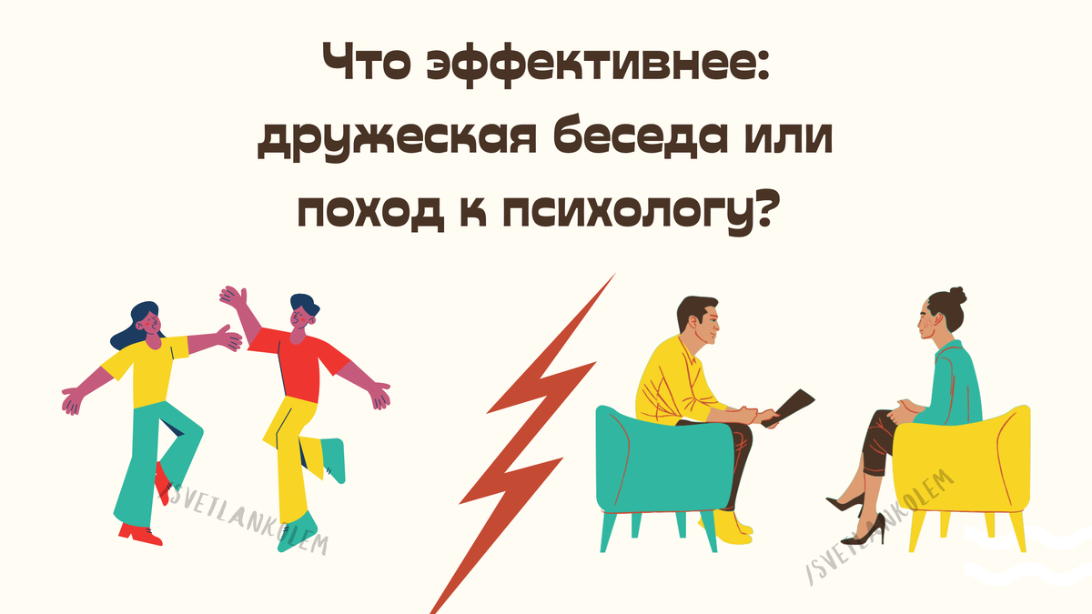Дамы и господа, начинаем битву века! В левом углу самый «стопудовый вариант» решения всех проблем — встреча с друзьями. В правом углу почему-то для многих сомнительное, но действенное решение — посещение психолога. Теперь без шуток. Несмотря на растущую популярность психологии, многие уверены, что вечер в компании друга (друзей) способен заменить консультацию со специалистом. Попробую объяснить, почему это не так. ❓Если нет разницы, зачем платить больше? Процесс одного и второго действия схожи. Человек излагает свою проблему человеку, которому доверяет. Но уже на этом этапе есть разница. У многих в голове крепко сидит старая установка «Сор из избы не выносят». Рассказать другу правду о тех же самых домашних страстях — хочется, но не можется. Поэтому до чужих ушей, в лучшем случае, доходит маленький процент истины. В остальном всё копится внутри. Что не полезно от слова совсем. А дальше разводы, где друзья семьи разводят руками со словами «Так хорошо жили. Не ругались никогда. А тут т