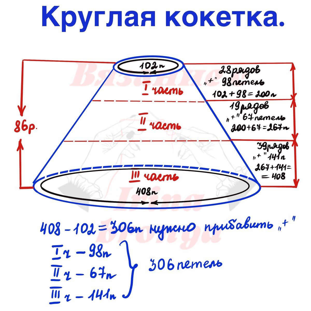 Рубрика: “Вязальные шпаргалки”. Для вязания круглой кокетки, можно использовать готовую схему жаккарда или ажурного узора, в которых прибавки предусмотрены в схеме. Но можно расчитать самой. Например: Плотность вязания - в 1 см - 2,5 петли и 3,3 рядов. Снимаем мерки: ОГ(объем груди) - 110 см ОШ (объем шеи) - 36 см ДИ (длина изделия) - 70 см ДР (длина рукава) - 76 см Определяем высоту кокетки по формуле. 25% ОГ = (25 х 110) : 100 = 27,5 Полученный результат можно уменьшить на 1,5 - 2 см 26 см х 3,3 р = 86 рядов - высота кокетки. Ширина изделия по линии груди. ОГ - 110 см; ½ ОГ = 55 х 2,5 = 138 п + свобода облегания. Подрез: Составляет 8 % петель ОГ = (138 х 8) : 100 = 11п - подрез. Определяем минимальную ширину кокетки (горловина) ОШ + прибавка на свободу облегания. 36 + 5 = 41 х 2,5 = 102п Рукав по формуле: 33% ОГ = (33 х 110) : 100 = 36, 3 х 2,5 = 90, 75, округляем - 90п с учетом подреза. Ширину рукава рассчитываем по формуле - 90% ОР(40 см) или вяжем спицами на 1-1,5 размера меньше.