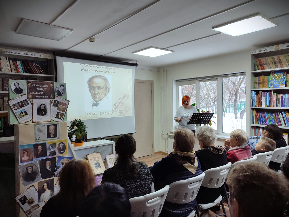 Фёдор Иванович Тютчев — один из величайших русских поэтов, чьё творчество оставило заметный след в истории русской литературы. В 2023 году в нашей стране отмечают 220-летие со дня его рождения. 1 декабря в Библиотеке семейного чтения состоялась литературно-музыкальная гостиная «В Россию можно только верить». Библиотекарь Елена Марьина рассказала о том, что долгие годы Ф. И. Тютчев трудился на государственном поприще — дипломатической службе за пределами России. Всю свою жизнь он честно служил интересам Родины, страстно желал блага и процветания своему народу. Проследить творческий путь великого поэта участники вечера смогли, перелистывая страницы личной жизни Федора Тютчева. Вспоминали яркие события из его биографии, прекрасные и трагические истории взаимоотношений с Амалией Лерхенфельд, Элеонорой Петерсон, Еленой Денисьевой, без которых невозможно представить и почувствовать весь лиризм произведений Тютчева. Прозвучали стихи о любви, которыми мы не перестаем восхищаться: «Она сиде