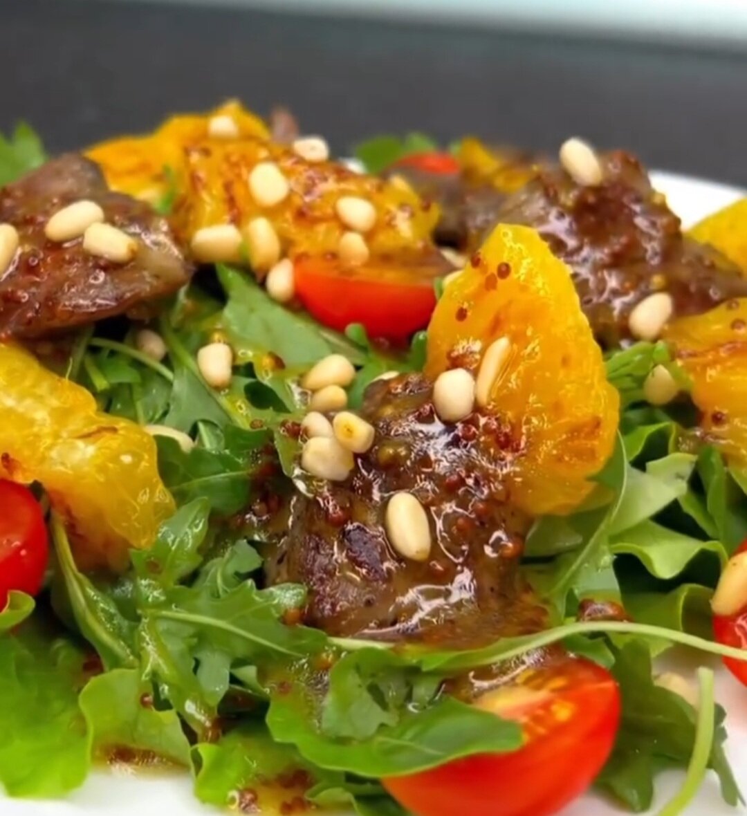 Продолжаем рубрику "Подготовка к новому году". Выбираем, чем же вкусным и полезным украсить праздничный стол. Поделюсь классным питательным салатом! Многим, для восстановления здоровья рекомендуют отказаться от многих продуктов. Кому сложно сразу это сделать, можно делать замены вредных продуктов на полезные или менее вредные. К примеру, на видео используется сахар. Но все знают, как употребление сахара влияет на организм. Я в этом случае делаю замену обычного белого сахара на кокосовый или сироп топинамбура. Либо можно использовать хороший сахзам. ГОТОВИМ⤵️ Тёплый салат с куриной печенью 🧆 ⠀ Сохраняй скорее в свою копилку, чтобы не потерять📌 ⠀ 🔹ИНГРЕДИЕНТЫ: - куриная печень - салат/руккола - помидоры черри - апельсин - подсластитель по вкусу - сливочное масло - кедровые орешки ⠀ Заправка на 2 порции: - оливковое масло - 1ст.л - зерновая горчица - 1ч.л - мёд - 1ч.л ⠀ Приготовление на видео в моей рубрике❤️ Заходите👌