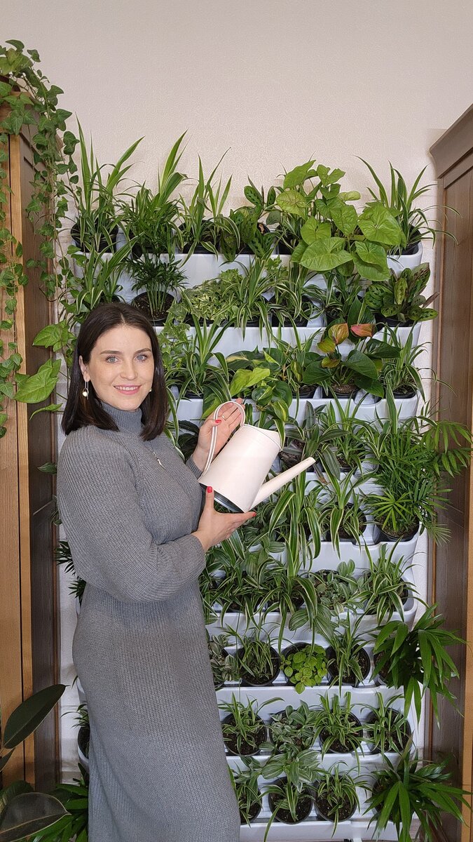 С поливом всё просто, воду заливаю прямо в фитомодуль до специальной отметки, она равномерно по модулю распределяется и растения её впитывают Как часто поливать? Всё зависит от температуры в комнате, у нас жарко, поэтому я поливаю примерно 2 раза в неделю Если некоторые растения быстрее других расходуют воду, то их можно полить отдельно, но из модуля лучше достать, потому что при верхнем поливе прямо в модуле вода льется мимо Стена разрастается, растения чувствуют себя прекрасно 💚 Выставила на нижние ряды недавно пересаженную вторую часть хлорофитумов, разница во времени посадки вроде и небольшая, а визуально уже заметно отличаются