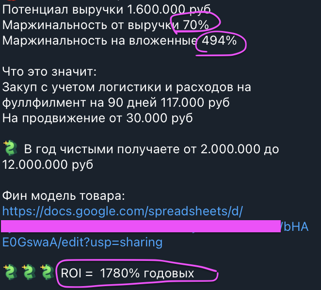 На самом деле "КАК" заработать - это не вопрос. Берешь любой товар, пусть даже с прибылью 5%. Со стартовым бюджетом в 100тыс рублей, ты сделаешь 10 млн лет через 40... Оно тебе надо? Поэтому вопрос не в том "КАК", а в том "КАК БЫСТРО" сделать эти деньги. Дочитай этот пост и ты поймёшь основу, благодаря которой сможешь обогнать 90% селлеров. Итак, начнем. Большинство селлеров на ВБ, Озон и других маркетах оперируют цифрами которые популярны. Про эти цифры говорят из каждого утюга и кажется, они уже стали 100% истиной. Но именно из-за таких расчётов многие не могут вырасти на маркетплейсах. Речь идёт о маржинальности, и многие ее считают от выручки. Уже стало истиной, что: 5-10% прибыли это плохо 10-20% нормально 30% очень хорошо Больше 35% почти недосягаемый результат. Многие про него слышали, но никогда не видели вживую таких товаров, иначе бы продавали только их. В чём подвох прибыли от выручки: Это показатель который позволит тебе понять ЁМКОСТЬ твоего товара в чистых деньгах. Напри