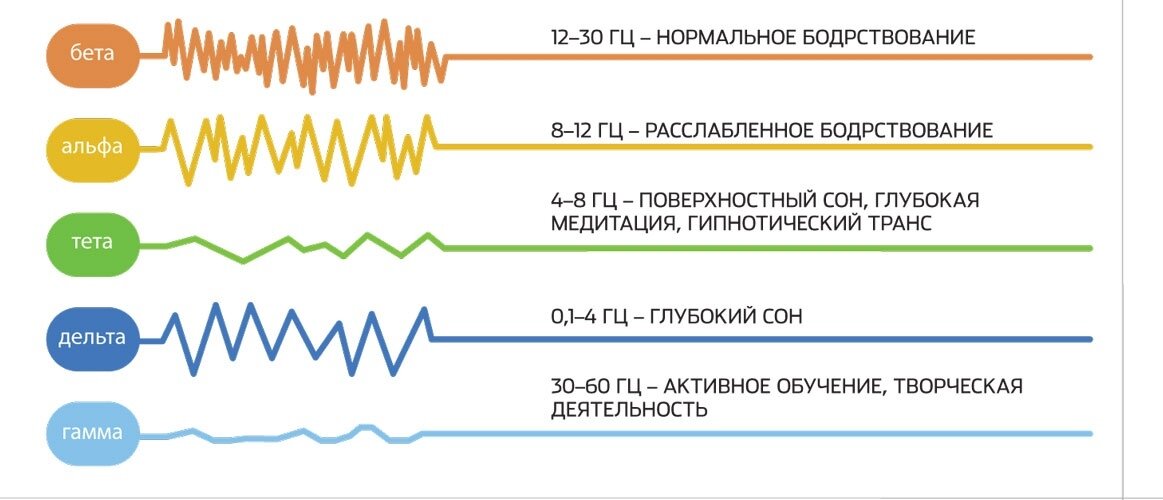 В нынешний век информации и технологий мы так много знаем о научных достижениях, но лишь малую толику этих знаний используем в повседневной жизни. Понимание режимов работы мозга поможет нам сгармонизировать работу чакр, повысить жизненный тонус и одержать победу в борьбе со стрессом. Итак, мозг работает в пяти частотных диапазонах: три режима для отдыха и два для активной деятельности. Дельта-волны (1-4 Гц) Дельта-ритмы самые медленные ритмы нашего головного мозга. Дельта-волны доминируют, когда мы в глубоком сне или без сознания. В этом состоянии наш мозг выделяет наибольшее количество гормона роста, а в организме интенсивно идут процессы самовосстановления. Тета-волны (4-7 Гц) Тета-состояние является промежуточным между сном и бодрствованием, открывает доступ к подсознанию и впускает информацию, меняющую привычные модели поведения. Здесь снижается мышечное напряжение, наступает глубокое расслабление, появляются яркие образы. Исследования воздействия тета-частот показали улучшение ин