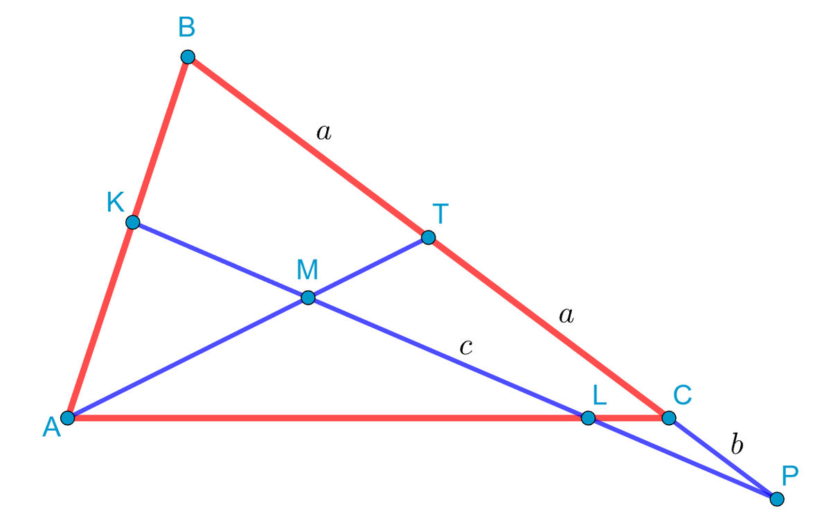Задача, которую мы сегодня обсудим, взята из домашнего задания, которое задали одному моему ученику на курсах Малого мехмата МГУ, где он учится. Задача не из простых, поэтому посчитал нужным выложить здесь её решение. Вдруг, кому-то ещё понадобится. Через точку M - точку пересечения медиан треугольника ABC проведена прямая, пересекающая стороны AB и AC соответственно в точках K и L и продолжение BC в точке P (C между P и B). Докажите, что 1/MK = 1/ML + 1/MP. Изобразим ситуацию на рисунке: Ввели следующие обозначения: T - середина BC, BT = TC = a, CP = b, ML = c. Будем доказывать, что 1/MK - 1/ML - 1/MP = 0. Для этого выразим MK, ML и MP через a, b и c. Из теоремы Менелая для треугольника ABT и секущей KM получаем: AK/KB*(2a+b)/(a+b)*TM/AM = 1, но TM/AM = 1/2 (т.к. M - точка пересечения медиан треугольника ABC). Тогда AK/KB = (2a+2b)/(2a+b) или KB/AK = (2a+b)/(2a+2b). Прибавим по 1 к обеим частям полученного равенства, тогда KB/AK + 1 = (KB + AK)/AK = AB/AK = (2a+b)/(2a+2b) + 1 = (4a+3