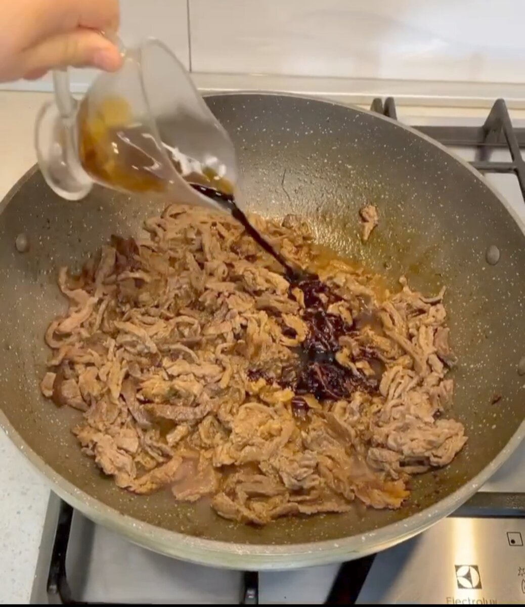 - К мясу добавляем соевый соус, обжариваем 2 мин. Добавляем лук, обжариваем ещё 2 минуты. Далее добав