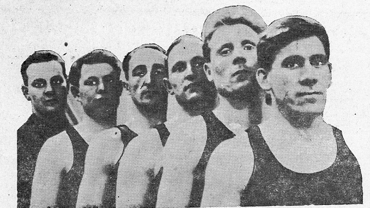 Сборная Москвы – чемпион СССР 1935 года. Слева направо К. Травин, Е. Бокуняев, А. Лобанов, В. Горохов, А. Зинин