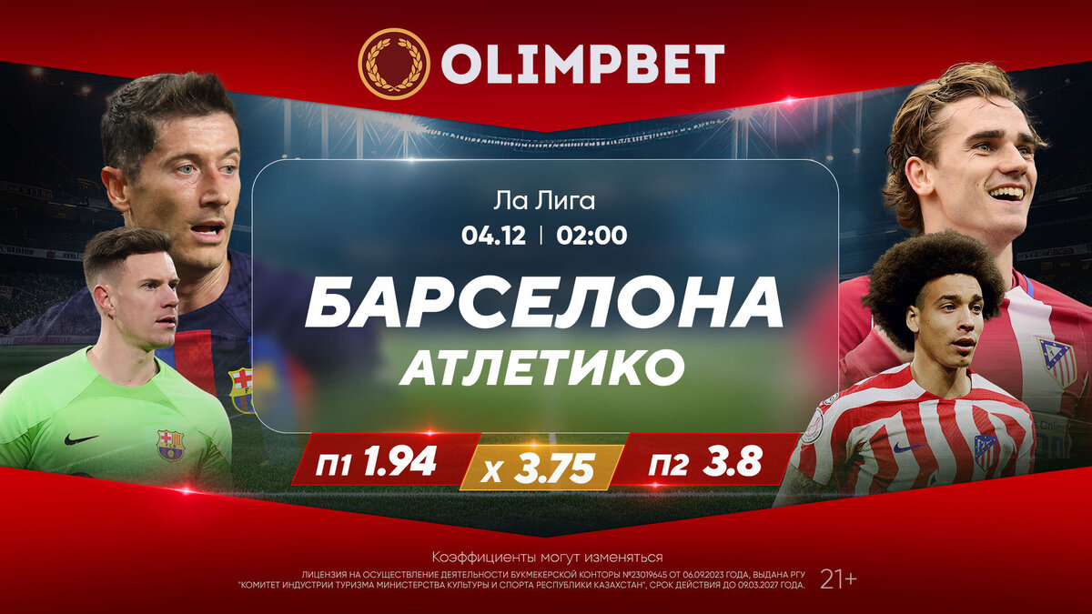 В матчах воскресенья в Серии А и Ла Лиге сразятся «Наполи» с «Интером» и «Барселона» с «Атлетико». Ла Лига. 15 тур. «Барселона» – «Атлетико». 4 декабря, 02:00 (по времени Астаны) После 14 туров соперники имеют по 31 очку и делят третье-четвертое места в таблице Ла Лиги. Отставание от идущего первым «Реала» – всего три балла, и логично, что терять очки нет желания ни у команды Хави, ни у банды Симеоне. А значит грядет битва! В линии самого щедрого букмекера Казахстана можно найти такие коэффициенты на исходы противостояния: П1 – 1.94, Х – 3.75, П2 – 3.8. Каталонцы идут фаворитами во многом за счет фактора своего поля. Но для «матрасников» что Олимпийский стадион Барселоны, что любая друга арена – ныне отнюдь не гандикап в пользу соперника. Не зря нынешний «Атлетико» был назван бандой – Симеоне в последние полтора сезона сумел переломить хребет собственным тренерским принципам, которые дотоле казались незыблемыми. А именно – игре от обороны, суперстрогости в защите, из-за чего футбол «Ат