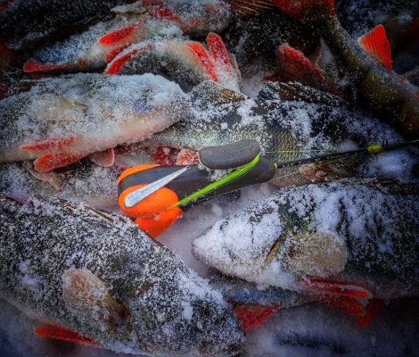 Пошел потихоньку в берег. Мимо толпы. Хотел дойти до тростника, где на небольшом участке не было никого. Пришел, но там небыло людей, за то флажки от жерлиц. Не стал мешать. Пошел в сторону нашего транспорта, иногда опуская блесну в старые лунки. Пару часов назад тут сидела толпа и лед был как решето. Толпа ушла, а решето осталось. В каждой лунке рыбка есть. Остатки самых привередливых окуньков. Маленькая блесенка «Киса», тонкая лесочка и некоторых удавалось уговорить.
