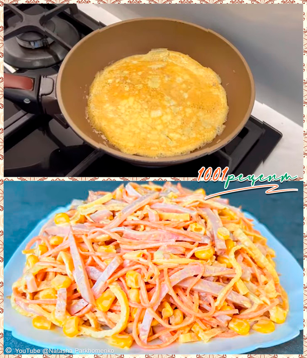 Для его приготовления вам не понадобится много сил, времени и денег. В нем идеально сочетаются все ингредиенты - попробуйте сами! Ингредиенты 🔸Ветчина - 200 гр 🔸Кукуруза консервированная - 125 гр 🔸Яйцо куриное - 2 шт 🔸Морковь по-корейски - 100 гр 🔸Соль по вкусу 🔸Масло растительное для жарки блинчиков 🔸Майонез по вкусу Как приготовить салат с яичными блинчиками и ветчиной 1 яйцо разбиваем в миску, солим по вкусу и взбалтываем вилкой. На плите разогреваем сковороду, смазываем растительным маслом и выливаем яйцо. Обжариваем как блинчик с двух сторон до золотистого цвета. Точно так же поступаем со вторым яйцом и жарим второй яичный блин. Ветчину нарезаем тонкой длинной соломкой. Яичные блинчики разрезаем пополам, складываем стопкой и затем нарезаем тонкой соломкой. Все подготовленные ингредиенты складываем в салатник, добавляем кукурузу и морковь по-корейски. Заправляем майонезом по вкусу и перемешиваем. Салат сразу подаем к столу. Приятного аппетита! Салат с яичными блинчиками