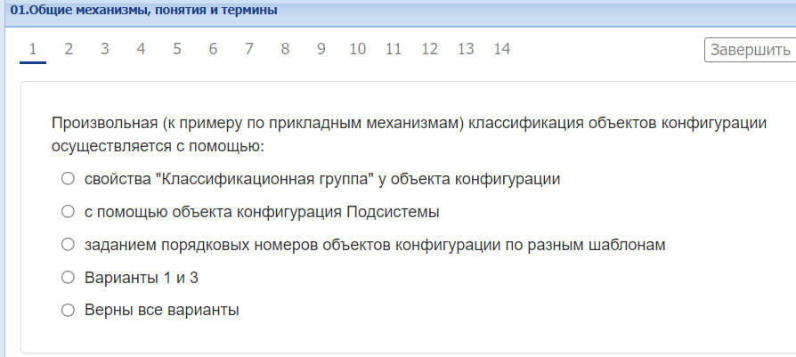 Вопросы ниже. Жирным шрифтом выбранный мною вариант ответа. По Итогу тест сдан на 92%. Один из ответов неверен. 1. Произвольная (к примеру по прикладным механизмам) классификация объектов конфигурации осуществляется с помощью: с помощью объекта конфигурация Подсистемы 2. В каком объекте производится редактирование информации пользователем (например экземпляра документа)? Форма объекта 3. Какие варианты подчинения существуют в системе 1С:Предприятие 8? Верны все указанные ответы 4. Где определяется структура, прикладная логика, создаваемого бизнес-приложения в системе 1С:Предприятие 8? Конфигурация 5. Механизм "История данных" (версионирование) позволяет настраивать хранение истории данных до: Варианты 1 и 2, и 3 6. Где хранятся учетные данные бизнес-приложения в системе 1С:Предприятие 8? Информационная база 7. Какую конфигурацию можно изменять интерактивно в конфигураторе? Основная конфигурация 8. При настройке ограничений прав доступа (в ролях), при определении шаблонов: в них м