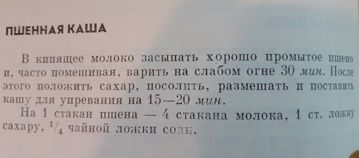 Сегодня я приготовила пшенную кашу на молоке по рецепту советской кулинарной книги о вкусной и здоровой пище. Оригинал рецепта выглядит так Вот мой набор продуктов Пшено надо хорошенько промыть. Я промывала 2 раза в холодной воде и 3 раза кипятком. 4 стаканов молока у меня не было, получилось 2 стакана молока и 2 стакана воды. Когда молоко закипело, добавляем в него промытое пшено, и варим 30 минут, часто помешивая, на очень маленьком огне. Через полчаса добавляем в кашу сахар и соль, и оставляем под крышкой ещё немного потомиться. Вот такой получился итоговый результат Приятного аппетита).