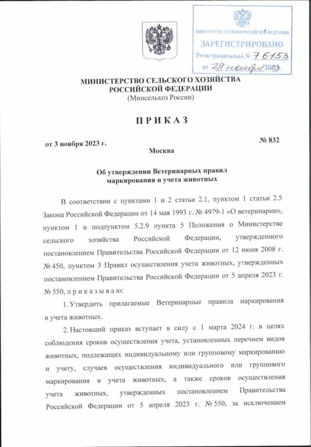 Документ описывает правила для всех животных, но и рыбоводной тематики тоже касается. Приказ Министерства сельского хозяйства Российской Федерации от 03.11.2023 № 832