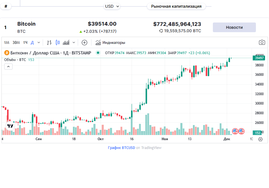 На этой неделе биткоин подскочил до нового годового максимума в $39 800. 3 декабря ведущий актив торгуется на уровне $39 500, что соответствует недельному росту на +2,1%. График от TradingView Объем торгов, составляющий около $20 млрд, показывает, что объем торговли BTC также растет. В то же время индекс страха и жадности, равный 74, подчеркивает бычьи настроения многих инвесторов. В последний раз BTC двигался в подобном темпе 19 месяцев назад, и предстоящий халвинг всегда считался одним из крупнейших криптособытий за всю историю. Индекс доминирования биткоина является важным индикатором для определения баланса сил между BTC и альтернативными активами. В настоящее время около $772 млрд от общей рыночной капитализации ($1,55 трлн) приходится на инвестиции в BTC. Это соотношение соответствует индексу доминирования BTC в 53,2%. График от TradingViewХотя Ethereum на этой неделе движется вниз на -1,9%, ведущий альткоин все еще торгуется выше важной отметки в $2000. 3 декабря цена ETH состав