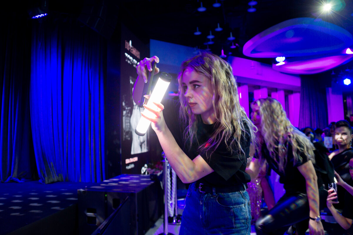 Снимала я как-то раз репортаж о танцах на пилоне и познакомилась с фотографом. Он то мне и посоветовал лампу купил. На мероприятиях не всегда бывает нормальный свет, а чаще всего сине-фиолетовый и люди соответственно то желтые в сумраке получаются, то синие. Похожую лампу я позже потом встретила на церемонии награждения блогеров Топ-Блогер 2023. Вот не было бы лампы у девушки и было бы у нее лицо синее на моем фотоаппарате. Так что фото наглядно демонстрирует важность дополнительной подсветки. Вот у меня тогда еще лампы не было. Для наглядности покажу, как без подсветки фото получаются при таком свете. Если на показах моды еще как-то свет ставят правильный, то у музыкантов и на прочих мероприятиях обожают разноцветных свет, а фото получаются не очень. Вот пример фото, синяя подсветка в помещении есть, но с дополнительной лампой выходят нормальные фотографии. Поэтому фотографы всегда имеют дополнительную подсветку. Они бывают разные, бывают простые, но мне посоветовали купить многофун