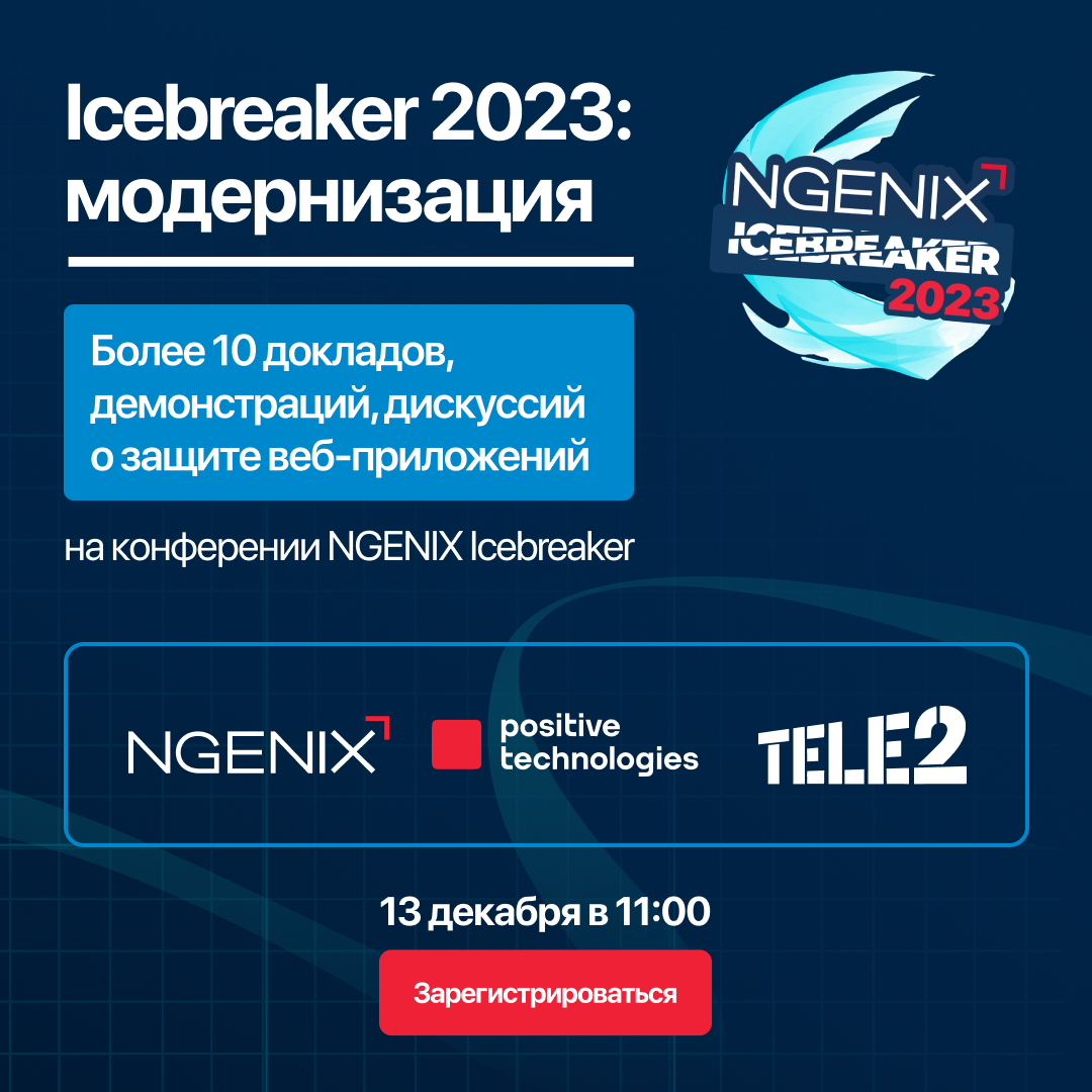 13 декабря в 11:00 NGENIX, провайдер облачных сервисов для киберзащиты веб-приложений, проводит свою ежегодную онлайн-конференцию NGENIX Icebreaker 2023, где эксперты от ИТ, ИБ и бизнеса обсудят актуальные проблемы, с которыми сталкиваются ИТ- и ИБ-команды веб-ресурсов: – Как встроить облачные сервисы в ИБ-стратегию? – Как помочь командам ИБ и ИТ сэкономить ресурсы? – Как эффективно использовать WAF? – Как бороться с ботами и DDoS-атаками? – Как не забыть пользовательском опыте и при этом противостоять новым типам угроз? Два потока докладов, воркшопов, демонстраций, дискуссий и кейсов для тех, кто отвечает за аптайм и защиту веб-ресурсов. Мероприятие открыто для всех, регистрация по ссылке: https://clck.ru/36q9D4