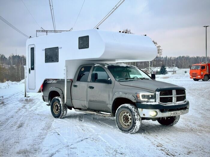 В прошлый раз я рассказывал про PILIGRIM CAMPER 600LX, который планирую строить для себя. Это будет самый большой в России жилой модуль на пикап. Но пока на его реализацию нет средств, да и в очереди на производстве у себя же я примерно на октябрь 2024 года записан... Но в это время мы уже реализовали PILIGRIM CAMPER 500LX. Пока внутри он еще в работе и всех секретов я не смогу выдать, но скажу что там уже авторская мебель из шпонированной орехом фанеры, столешницами под искусственный камень, 4 уровнями освещения, дорогой бытовой техникой и тд. В этот раз у нас там не только кондиционер, но и вытяжки над кухней, кофемашиной, стиральной машинкой на 2,5 кг и много чего еще. Все фасады стали круглыми, линии интерьера плавными. Но я уверен что скоро вы все сами увидите. А пока внешний вид на ДОДЖ РАМ 2500 (модуль уедет по готовности в Хабаровский край и будет жить на подобном пикапе, а пока мы погрузили его на пикап моего друга Ильи.)
