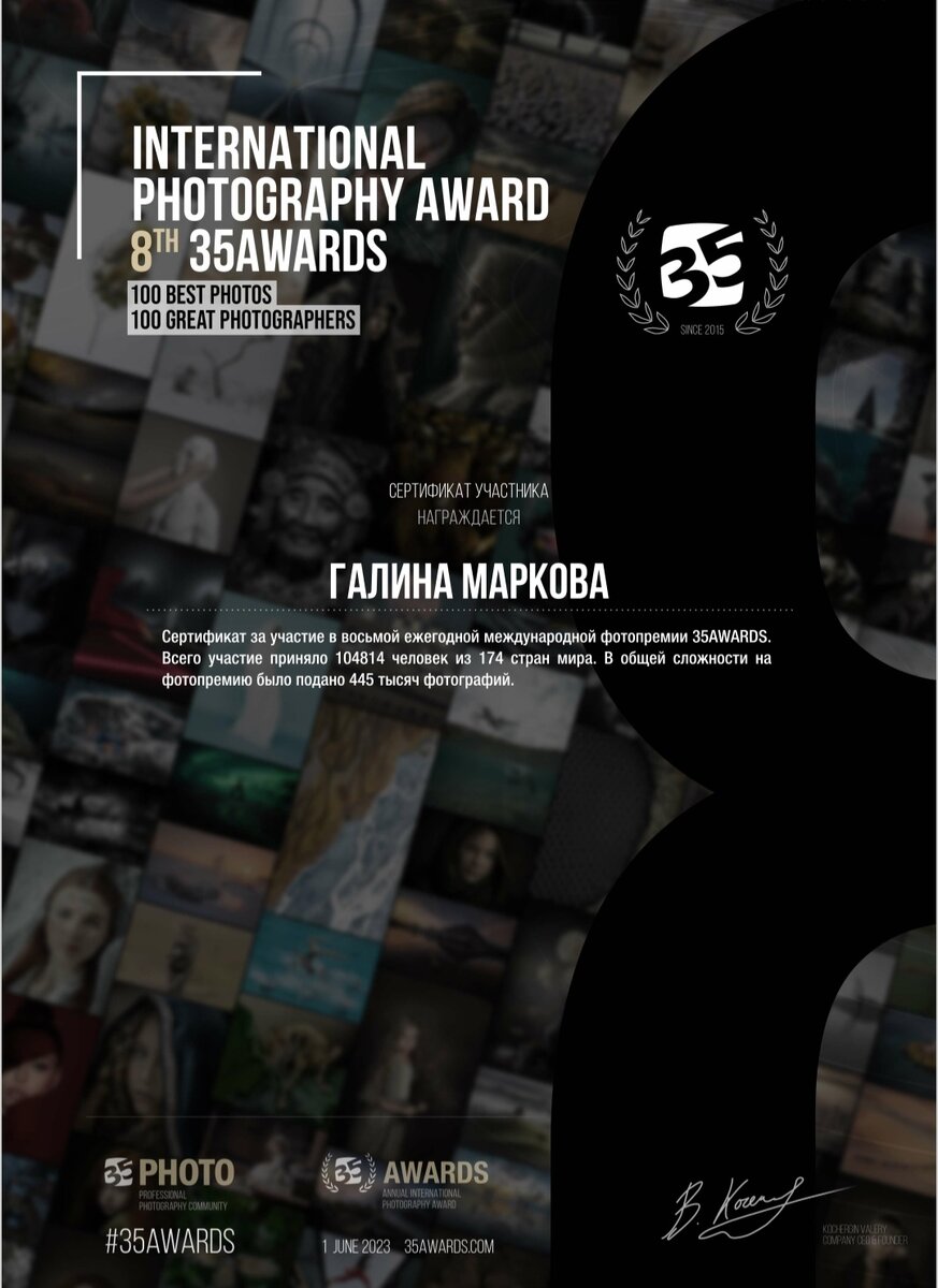 Привет, друзья! Примерно месяц назад я просила вас проголосовать за мои фото, выставленные на конкурс "Концептуальный минимализм", проходивший на международной фотопремии 35 AWARDS. Вчера получила сертификат участника, который на медународной фотопремии дают, если твоё фото вошло как минимум в топ-35%. Предлагаю теперь сравнить ваши предпочтения и то, как проголосовало международное жюри. Вот так выглядит рейтинг моих работ. Самый лучший показатель у фото букета ромашек. Оно вошло в топ-21% Мне эта работа особенно дорога, потому что её автором стала моя любимая внучка Варвара. Она подала мне идею снимка, когда мы летом собирали букет, чтобы пойти с ним на день рождения. Именно Варя держит ромашки в руке.😇 Изначально фото было цветным, для участия в конкурсе "Концептуальный минимализм" я его обработала и сделала черно-белым. Это условиями конкурса разрешено. Вот таким был исходник. Фото с каплями росы на траве вошло в топ -31%. Оно тоже было цветным, я его для конкурса перевела в ч