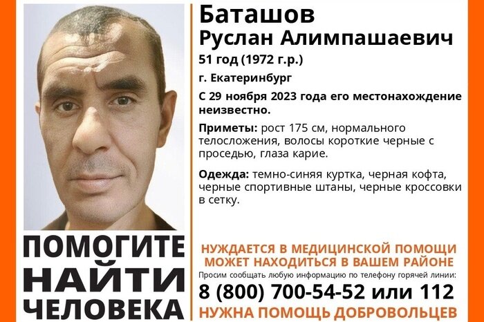 В Екатеринбурге пропал 51-летний Руслан Баташов. В этот день, 29 ноября у него случился инсульт, рассказала его супруга, сообщает Е1.RU.