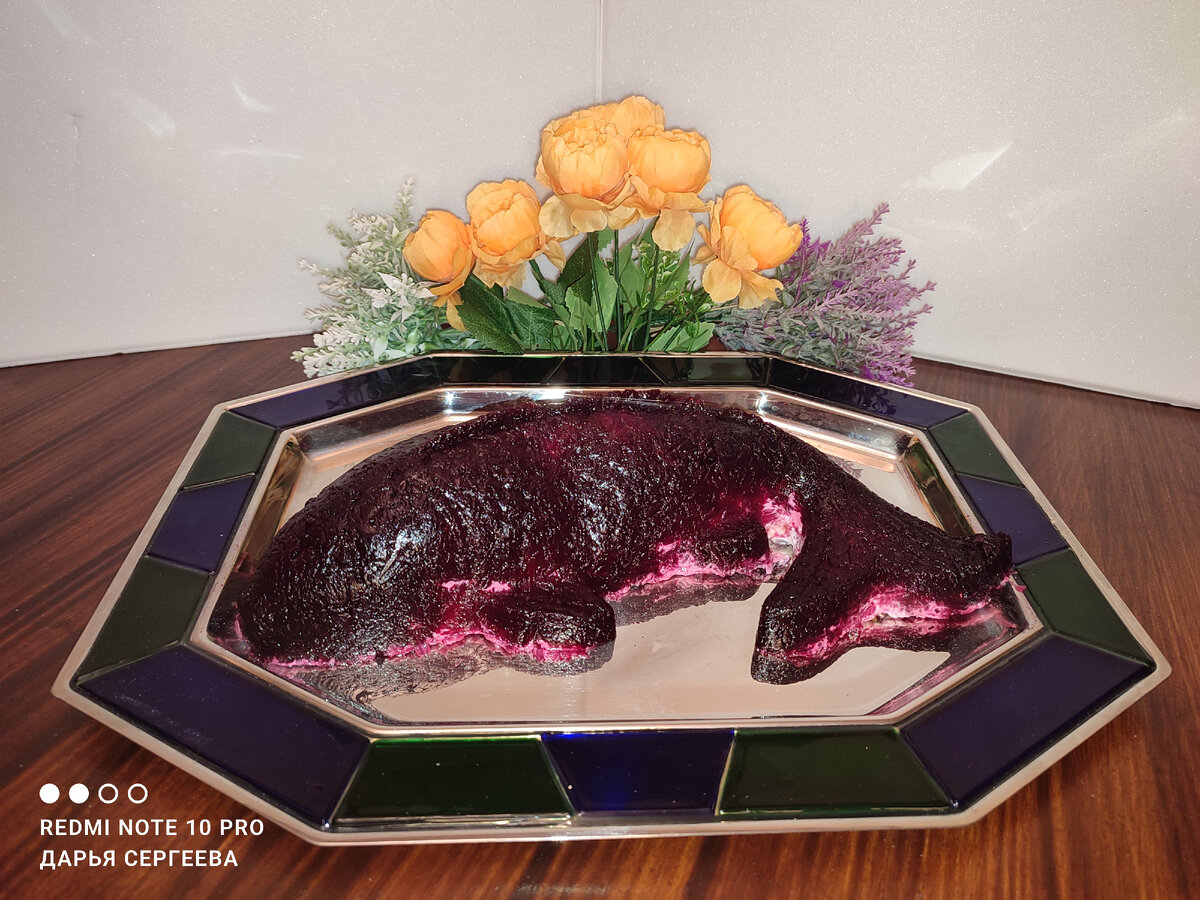 Красивая подача привычного блюда - объемная рыбка, фактурная, изогнутая. Это привлекло меня в форме в виде рыбы. Проверим, что получилось на практике. Фото без прикрас, описание процесса тоже) Формы есть разных размеров, я взяла самую большую из предлагаемых - длина 35 см Форма пластиковая, крепкость средняя. Немного гнется, но вызывает доверие Главный вопрос - вынется ли из нее красиво готовое блюдо Чтобы снизить риск, я промазала форму растительным маслом при помощи бумажного полотенца - несколько капель масла нанесла на полотенце и им прошлась по всей внутренней поверхности рыбки. Промазала совсем немного, чтобы сцепление с пластиком было меньше, и шанс вынуть блюдо был выше) Сварила овощи как на обычную порцию селедки: крупных 2 свеклы, 2 картофелины, 2 моркови и 2 яйца В форме селедка делается в обратной последовательности - верхний слой делаем первым, а нижний последний Приступаем Потерла свеклу на терке. Выбрала довольно мелкую терку, но не самую маленькую, чтобы не получила