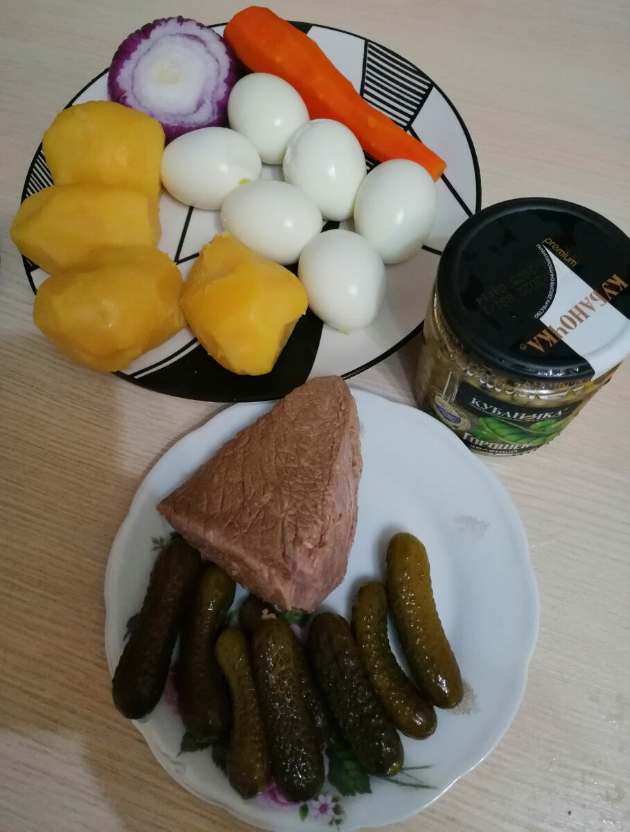 Друзья, всем привет! Близится к завершению 2023 год, а значит наступает главный семейный праздник, который любят и взрослые и дети. Поэтому начинаем репетицию Нового Года! Не будем нарушать многолетних традиций, а значит приготовим "Оливье". Рецептов приготовления этого салата множество, сегодня предлагаю приготовить Оливье с говядиной. Нам понадобится:отварная говядина, отварные яйца, отварные картофель и морковь, маринованные огурчики, зелёный горошек и салатный лук! Заправлять салат по традиции будем майонезом! Количество продуктов, я думаю, каждый определит для себя в зависимости от количества салата, которое вам нужно. Приступаем к приготовлению. Мелко нарезаем луковицу и так же мелко морковь. Нарезаем кубиками отварную говядину и маринованные огурчики. Так же поступаем с отварными яйцами и картофелем. Отправляем всё в салатник, добавляем зелёный горошек, соль, чёрный молотый перец и заправляем майонезом! Готовый салат можно посыпать нарезанной зеленью. Делитесь своими реце
