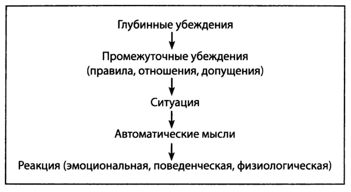 Ранее мы рассматривали с вами, что такое убеждение и как оно влияет на нашу жизнь. Сегодня мы с вами еще раз рассмотрим схему, которая нам даст понять последовательность и что за чем стоит лечить. В данном случае глубинные убеждения влияют на особенности восприятия, что выражается в специфичных для ситуации автоматических мыслях. Мысли, в свою очередь, влияют на эмоции, поведение и нашу физиологию. Важно отметить, что такая последовательность упрощает реальное положение дел. Так как мысли, настроение, поведение, физиология и среда постоянно влияют друг на друга. А так же существуют триггеры. Триггерами могут выступать: Последовательность событий может быть разнообразной, сложной, ситуаций-триггеров может быть несколько, так же и автоматических мыслей и реакций. Вопросы, которые задает себе терапевт на консультации, чтобы эффективнее проводить терапию. 1. Почему клиент оказался у меня на приеме? 2. Какие уязвимые места сыграли особую роль? 3. Как клиент справлялся с этими уязвимостями?