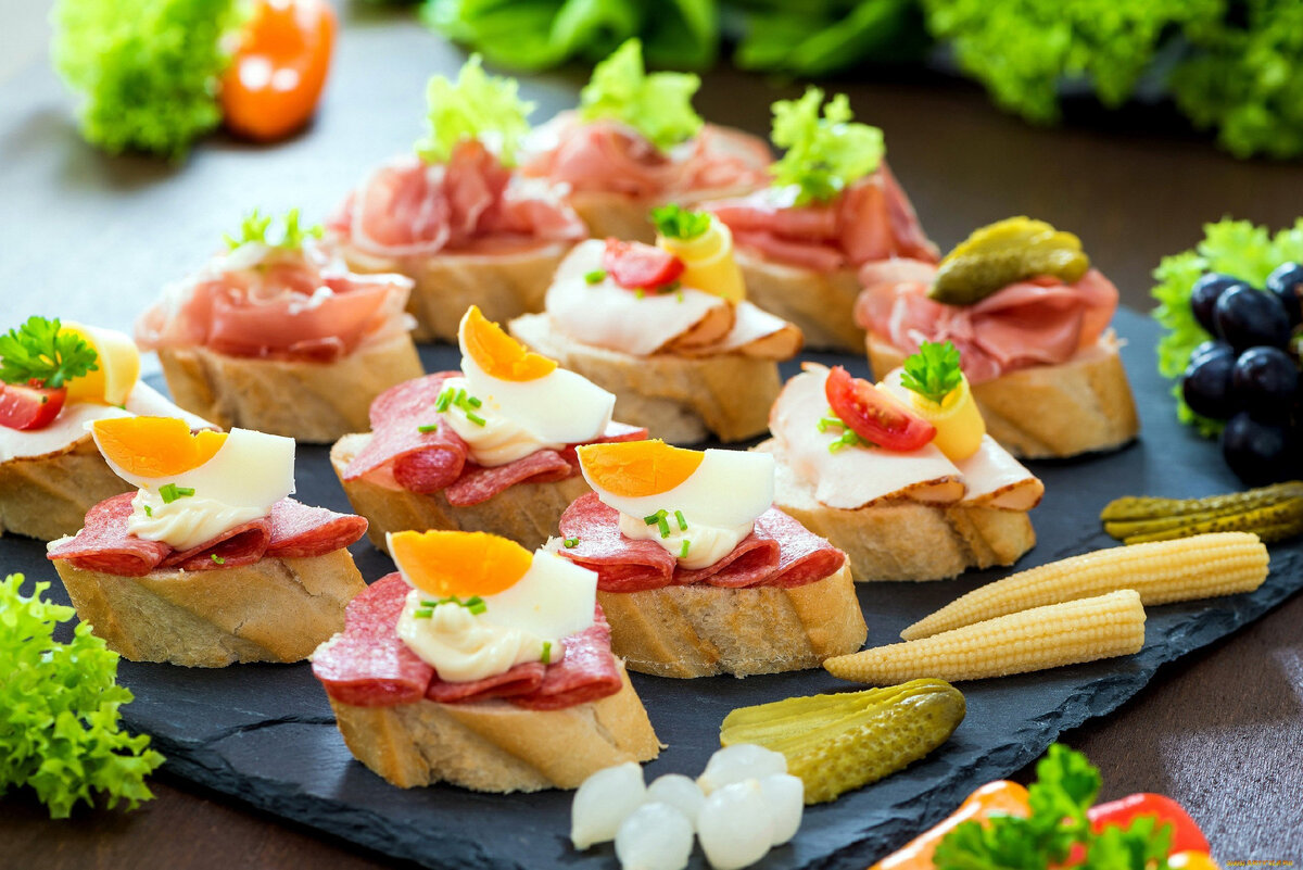 ТАРТИНКИ. Это тоже маленькие бутерброды на поджаренном хлебе,но их особенностью является горячий гарнир:рыбные и другие продукты в горячем виде укладывают на поджаренный хлеб. Подают тартинки на пирожковых или десертных тарелках. Для приготовления тартинок можно рекомендовать,например,жареную ветчину,бекон,корейку или колбасу с яичницей-глазуньей или с жареным луком,горячую говядину с соусом,горячие котлеты,сыр,запечный с ломтиками помидоров,паштет домашнего приготовления,курицу отварную кусочками,омлет с зелёным луком,а также рыбу и т.д.