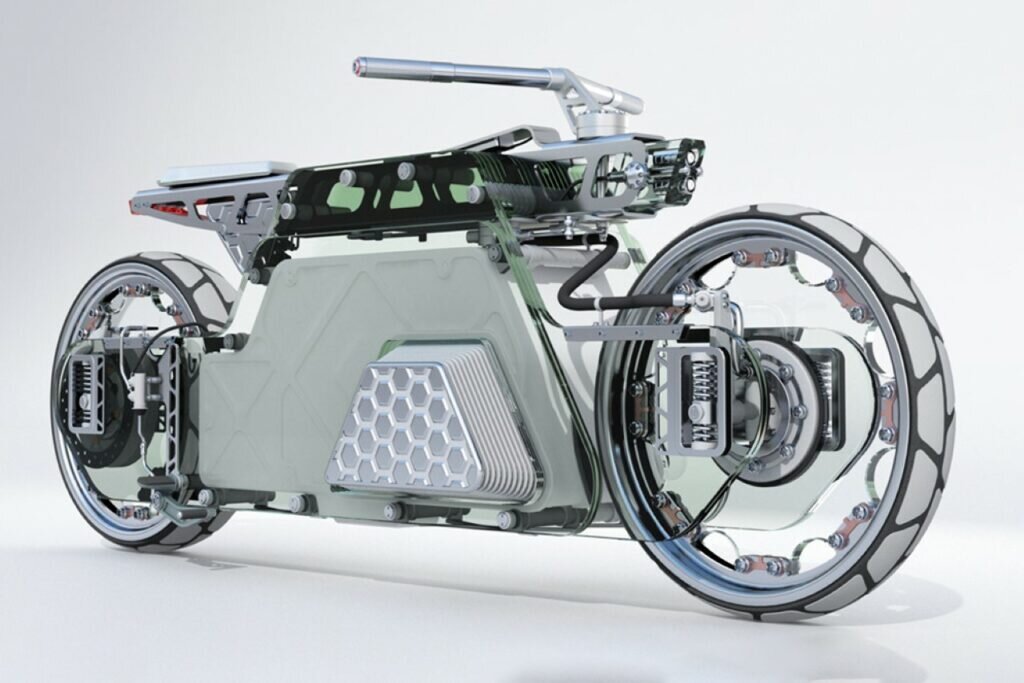 Названный Nu’Clear (потому что он новый и прозрачный), этот необычный двухколесный мотоцикл не похож ни на что, что вы когда-либо видели, потому что, хотя большинство мотоциклов выбирают большие обтекатели и детали кузова для придания характера, Nu’Clear идет совершенно противоположным путем. будучи прозрачным в своем подходе… нет, в буквальном смысле! Концепция мотоцикла (она, очевидно, еще не существует) сначала исследует довольно много. Он не только использует пуленепробиваемое стекло в элементах дизайна, но также использует стекло в несущих частях, таких как ступицы каждого колеса. Конечно, шасси мотоцикла по-прежнему выполнено из метала, но это необычное сочетание металла и стекла позволяет Nu’Clear довольно чудесно выделяться. Также дополнительные баллы, если вы заметили прозрачный топливный бак сверху, наполненный этанолом, на котором работает Nu’Clear. Nu’Clear был разработан в стиле Atompunk 50-х и 60-х годов, отражая потенциальную футуристическую эстетику того времени. Конечн