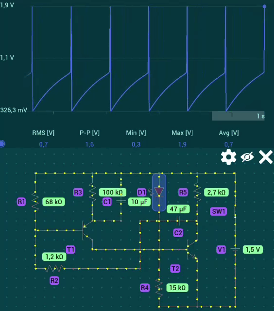 Когда оно достигает уровня (для кремниевого транзистора) примерно 0.6V Т1 открывается (ВАЖНО - ТОК ЧЕРЕЗ ТРАНЗИСТОР Т1 ИДЕТ ЗА СЧЕТ ЗАРЯДА КОНДЕСАТОРА С1), а Т1 в свою очередь открывает Т2.