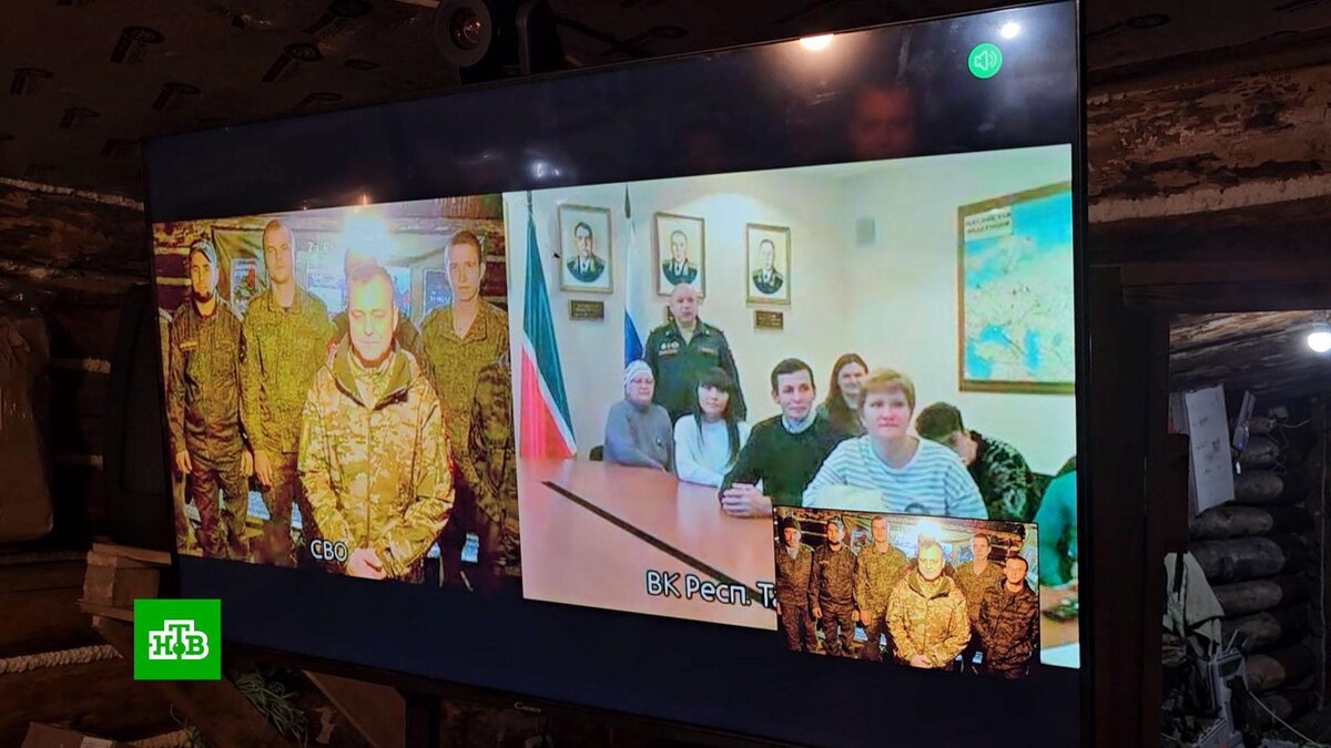 [ Смотреть видео на сайте НТВ ] Командование группировки «Центр» в зоне СВО организовало телемост с семьями для бойцов из республики Татарстан. Военнослужащие пообщались с родными в режиме видеоконференции через зашифрованный канал связи. Он соединил один из блиндажей со студией, организованной в региональном военкомате. Бойцы рассказали своим близким об условиях службы, а родственники поделились своими новостями. Военнослужащий: «Привезли ребят с переднего края. Они пообщались с родными и близкими, с матерями, с женами, с детьми, поздравили с днем рождения детей, даже такое событие сегодня было. Пообщались, рассказали, что у нас все замечательно, скоро победа, мы вернемся живые и здоровые к своим родным и близким». После завершения телемоста перед бойцами выступили артисты фронтовой концертной бригады округа. Они исполнили популярные военные песни, в том числе знаменитую «Катюшу». [ Смотреть видео на сайте НТВ ]