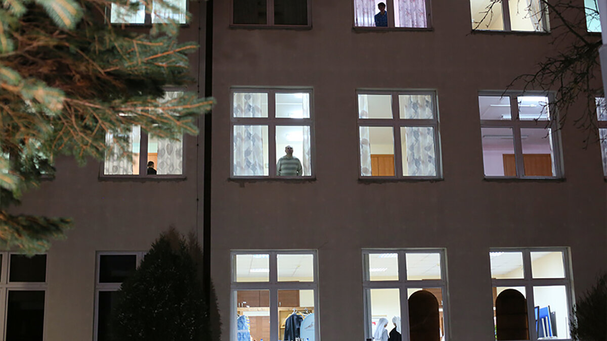Десятки лиц прилипли к окнам. Подопечные, которые не смогли сегодня участвовать в шествии с хоругвями, улыбаются, крестятся и машут руками проходящим по другую сторону стекла.