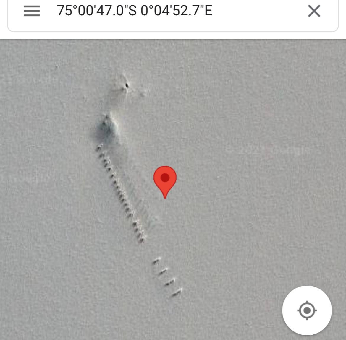 При вводе координат 75°0'46.98"S 0°4'52.71"E в поисковую систему Google Maps появляется нечто, что трудно объяснить. На широкой равнине можно увидеть объекты, напоминающие гребни.