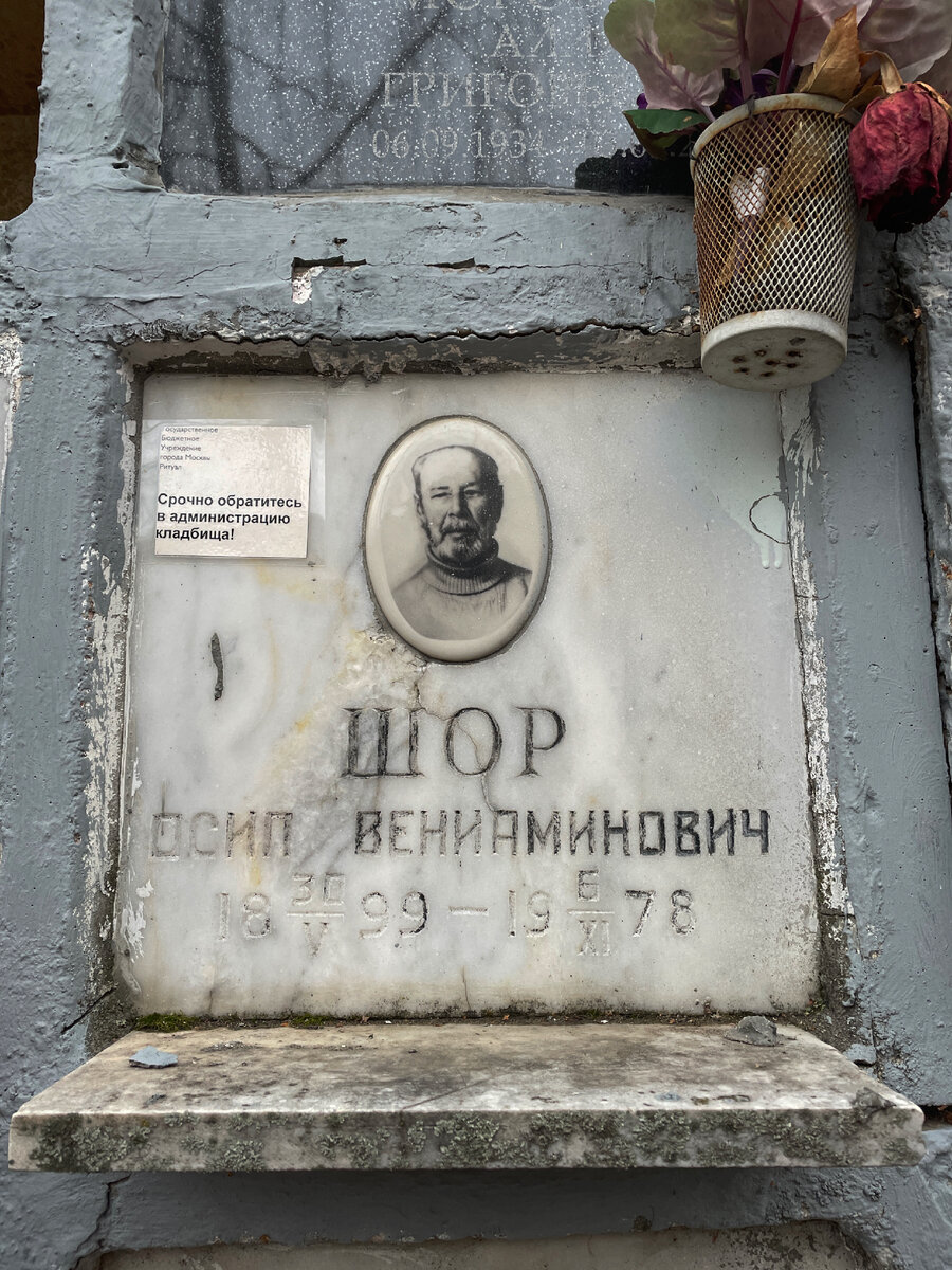 Начнем с колумбария. Здесь, во второй секции, размещена урна с прахом Осипа Шора (1899-1978), наиболее вероятного прототипа Остапа Бендера - героя романа "12 стульев".