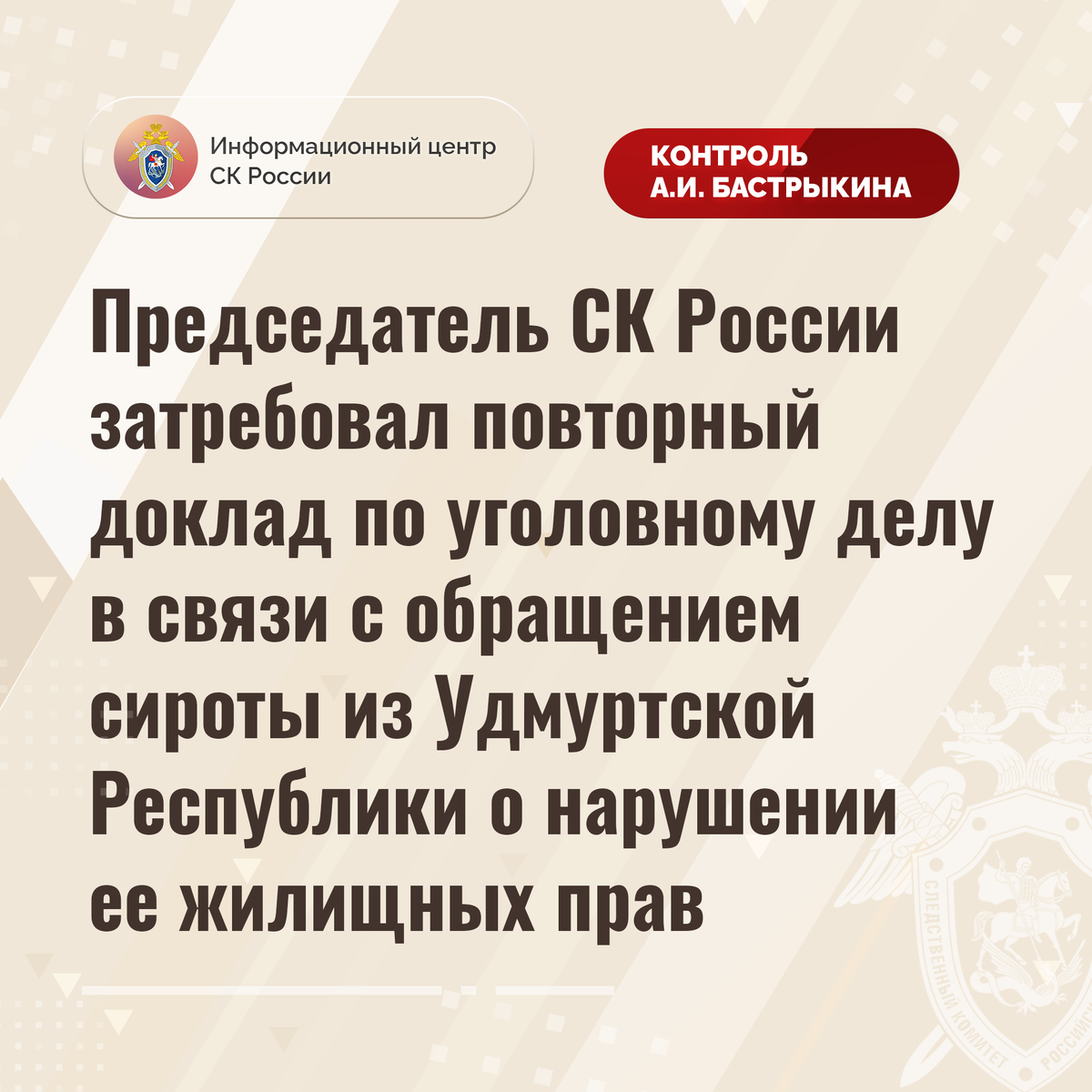Председатель СК России затребовал повторный доклад по уголовному делу в связи с обращением сироты из Удмуртской Республики о нарушении ее жилищных прав