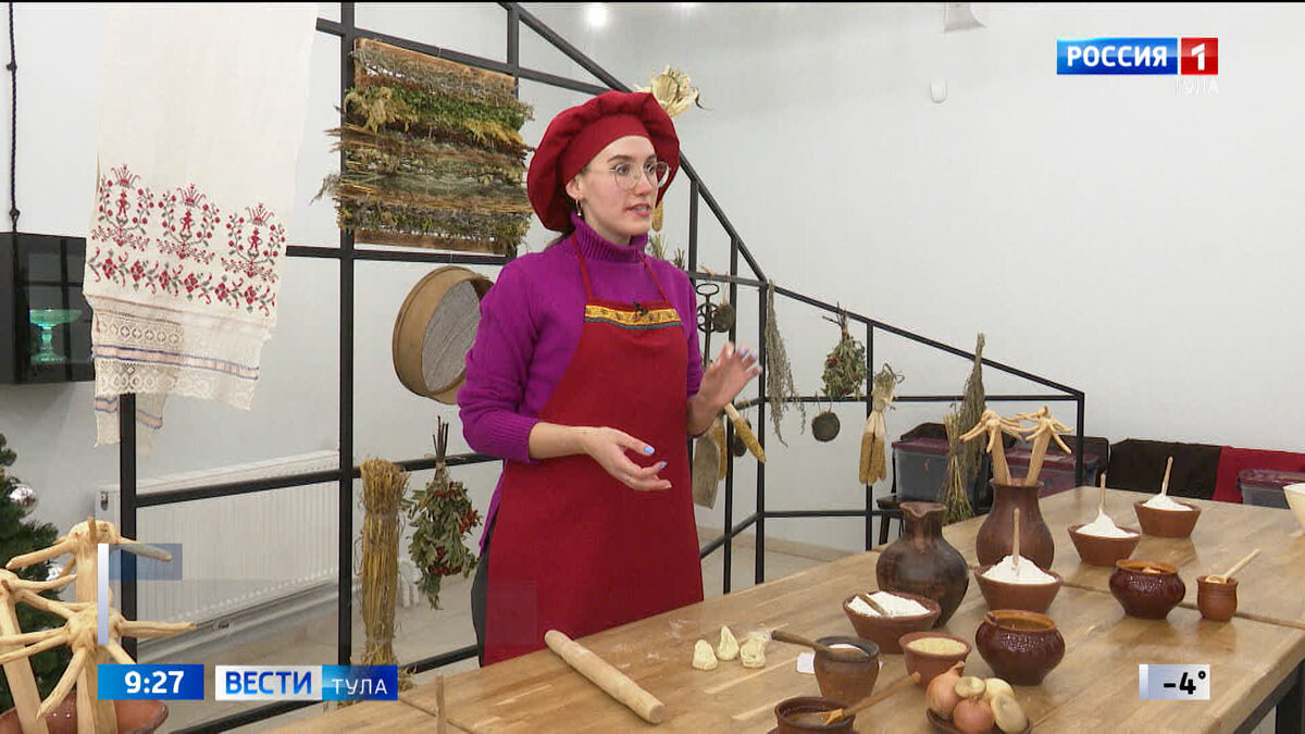 В пространстве “Историческая кухня” приготовим кундюмы вместе с Юлией Ярковской. Для этого нам понадобится горячая вода, немного растительного масла, щепотка соли и пшеничная мука. Добавим немного тёплой воды, на глаз добавим щепотку соли и тщательно все размешаем. Соль растворилась, и можно добавить ложечку растительного масла. Опять же все размешаем. Чтобы тесто не прилипало к рукам, хозяйка обязательно добавляла масло. Когда все растворилось, мы добавляем муки примерно 3 ложки, чтобы замешать колобок. А дальше посмотрим по консистенции, должен получиться плотный комочек. Мы оставим нашу заготовку на полчаса отдохнуть. Тесто должно насытиться кислородом, и уже отдохнувшее тесто придёт к нам на стол. С ним мы будем работать дальше. Тесто подошло, можем дальше с ним работать, присыпаем рабочую поверхность мукой, чтобы тесто не прилипало, слегка обваляем, покатаем и раскатаем в пласт тонкий. Это поможет сделать скалочка. Режем, итак у нас получится 4 кундюма. Нам обязательно нужно сдел