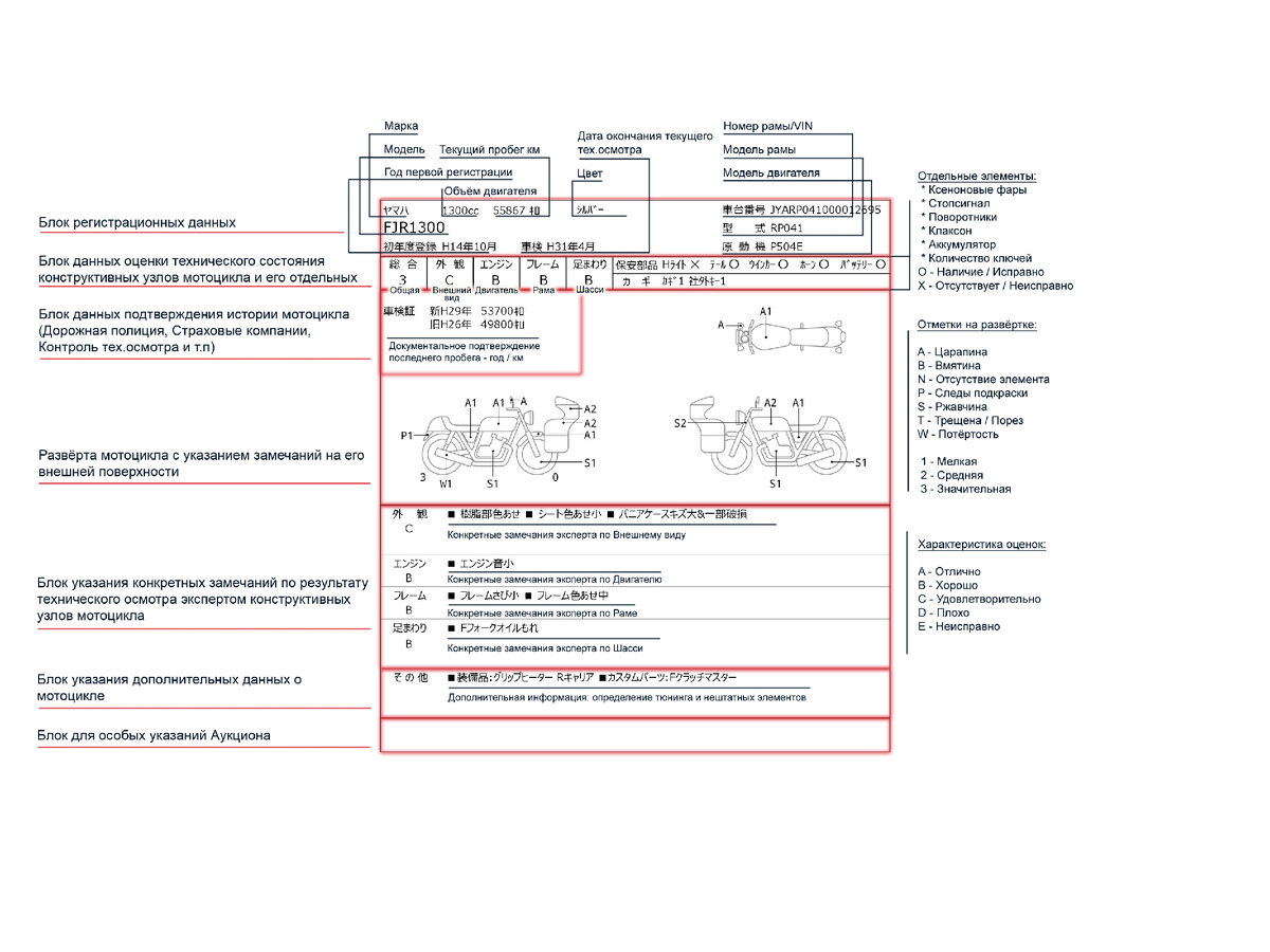 Если на мотоцикле есть повреждения, их степень оценивают по шкале от 1 до 3 баллов. Подробнее с примером аукционного листа вы можете ознакомиться на картинке ниже.