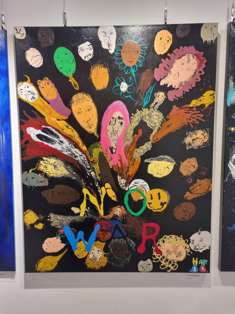 Спасибо Утраченной иллюзии за находку и перевод 🌸 Источник здесь 01.12.2023 Групповая выставка Хёнджуна Кима Групповая художественная выставка в которой участвует «Бог Вселенной», о которой было объявлено. Я пошла сразу после школы. Было трудно представить где именно расположена галерея, но мне все же удалось ее найти. 🖼️Первая картина Бога Вселенной Это картина под названием «Любовь Вселенной». Лично мне это произведение понравилось больше всего. Эта картина подписана словами: «Кто-нибудь, пожалуйста, остановите это (no war)». Ну... я не знаю, что ж за страна на картинке. 🖼️🖼️«Иди до конца» и «После страданий приходит счастье».(«под лежачий камень вода не течет») Не уверена насчет второй картинки, но первая кажется картинкой попыток найти что-то под землей. Я не знаю, что именно он хотел сказать этими рисунками. 🖼️🖼️«Слоненок» и «Папа слон» излучают разную интенсивность. 🖼️«Не курить» Не курите? Я даже не говорю по-английски.Что я помню об этой картине, так это т