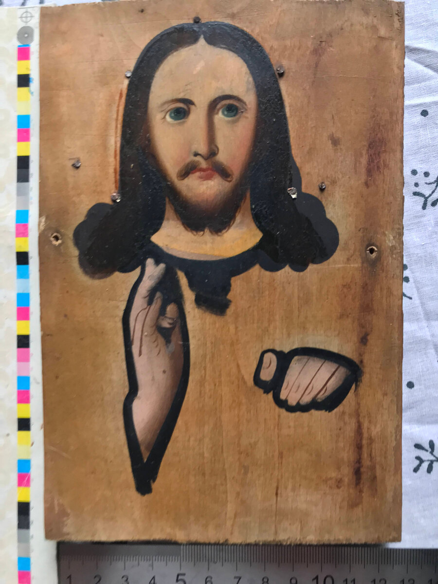 - подокладница, простенькая совсем, совсем недавняя в общем, сто с небольшим лет ей. И сколько тут хорошего, искреннего. Попадают они ко мне обычно сильно пострадавшие, что неудивительно: простые недорогие материалы, не рассчитанные на долгое хранение.Здесь давно утрачен тонкий фольговый окладик - и много грязей разного генезиса, и пострадавшая сосновая основа; всегда в целом понятно, что тут делать. Делаю подобные работы сериями - они типичные; несложные технически, но требующие полного внимания и неторопливости. Удаляю агрессивные колонии, фиксирую, стабилизирую, защищаю. Головка после удаления грязей и заполнения основных лакун выглядит непостыдно. Писали б хотя бы так многочисленные пищушие. Легко-легко прописываю недостащее - икона будет храниться, к счастью, без нового нелепого имитационного оклада. Чуть позже покажу несколько стадий работы с очень похожей иконой - и потом займёмся вещами повесомее.