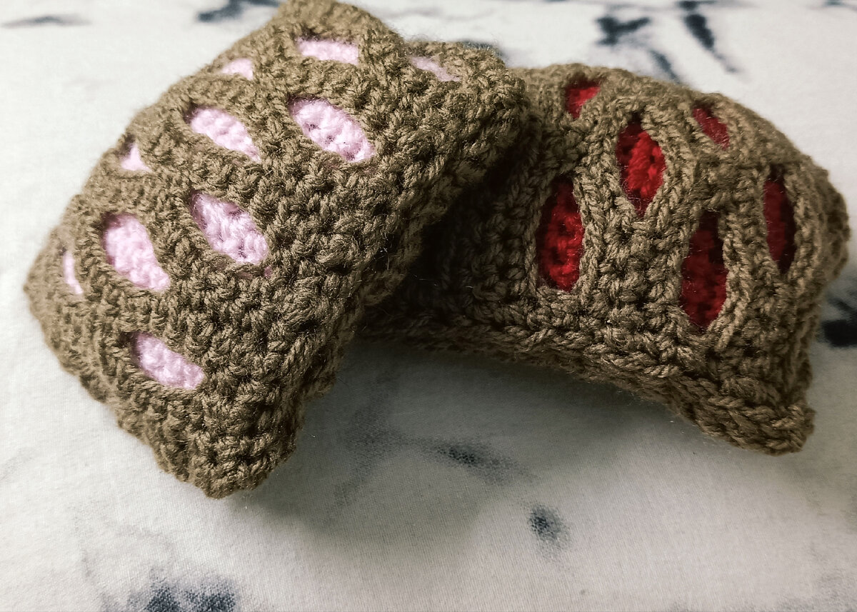 Для вязания таких слоек с начинкой вам понадобиться: -пряжа ПЕХОРКА Детская новинка 187 и 363(или другой "вкусный" цвет для начинки) -крючок 2,5-3,0 -наполнитель - синтепух -игла с широким ушком Условные обозначения: ВП-воздушная петля Сбн-столбик без накида Пр-прибавка Итаг, переходим к вязанию. Начинаем вязать с начинки. Слойка полностью вяжется прямыми рядами с воздушной петлей подъема в начале каждого ряда. Начинаем с 14 вп. (1-4 ряд) Вяжем в высоту прямыми рядами по 13 сбн в каждом. (5-18 ряд)Продолжаем вязать таким образом в высоту до 18 рядов. (19 ряд) Меняем нить на коричневую. Провязываем этот ряд за заднюю стенку петель 13 сбн (20-38 ряд) Вяжем прямо до 38 ряда по 13 сбн (39 ряд) Вяжем за заднюю стенку петель: 6 сбн+пр+6сбн Последующие ряды вяжутся за обе стенки петель. Под воздушными петлями пропускаем столько сбн, сколько вяжется ВП. (40 ряд) 1сбн+5вп+2сбн+5вп+1сбн (41 ряд)14 сбн (42 ряд) 4сбн+6вп+сбн (43 ряд)14 сбн (44 ряд)1сбн+5вп+2сбн+5вп+1сбн (45 ряд)14 сбн (46 ряд)4