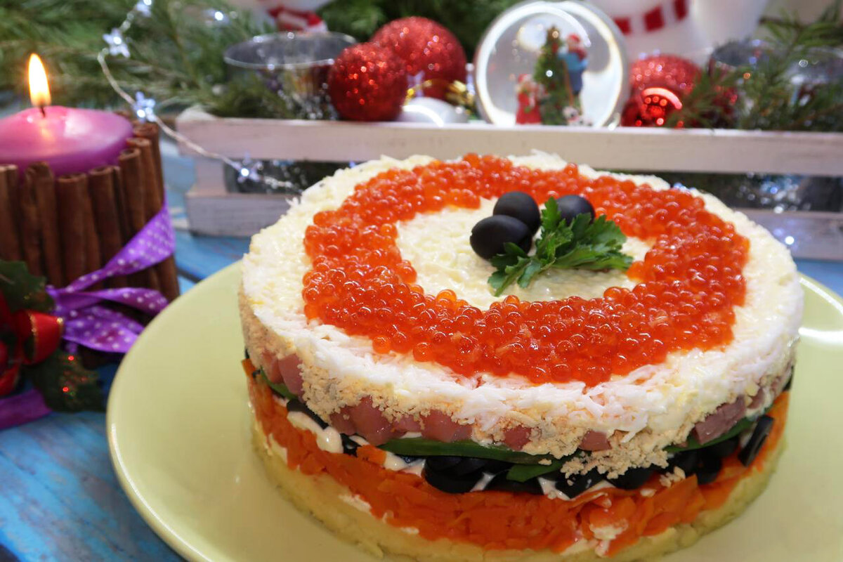 Салат Царский с красной рыбой и красной икрой на новогодний стол