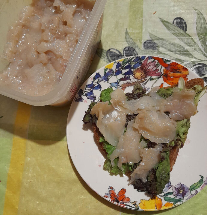 Красную рыбку многие солят. Я предлагаю более бюджетный, но не менее вкусный вариант, который и праздничный стол украсит. Соленая треска или пикша для бутербродов. Рыбку выбираем так, чтобы на срезе она была беленькой. Это свидетельствует о свежести. (самая свежая охлажденная треска имеет легкий радужный отлив на срезе). Рыбу (у меня пикша) размораживаем, снимаем филе и режем его на пластинки. Помещаем в миску, добавляем крупную соль (1 ст. ложка без горки на 500 г филе), 2-3 ст. ложки растительного масла (я взяла масло с экстрактом апельсина) и 1 ст. ложку коптильной жидкости (иногда называется «Жидкий дым») или 1 ст. ложку сока брусники, апельсина или грейпфрута. Хорошенько перемешать, уложить плотно в емкость и поместить под небольшой гнет на сутки. При хранении можно добавить сверху еще растительного масла. Примерное КБЖУ соленой трески (на 100 г) – 98/23,!/0,8/0. + 4 фото От наших друзей: Сергей Воронов, гитарист, создатель группы CrossroadZ, на Радио Медиаметрикс Больше общения и
